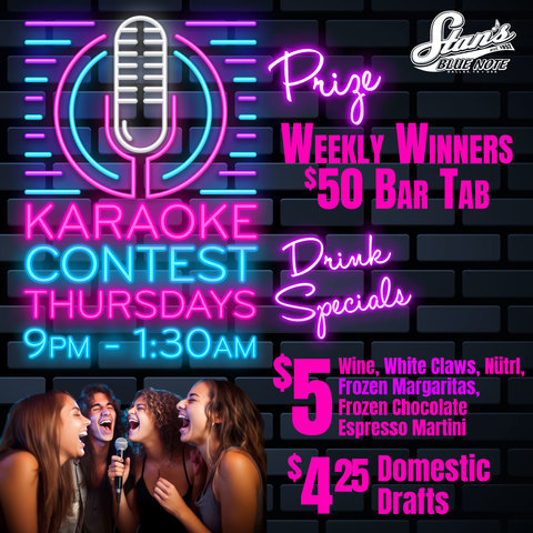 Free admission. Drink specials. Contests. Details https://stansbluenote.com/karaoke-contest-thursdays-every-thursday/
