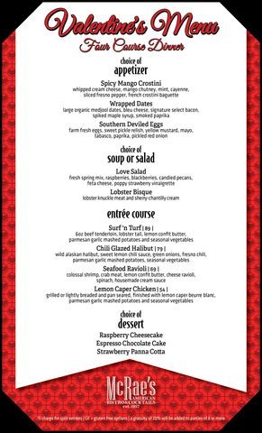 McRae’s American Bistro & Cocktails is setting the stage for a romantic and sophisticated Valentine’s date night with special menus available beginning Friday, February 9.